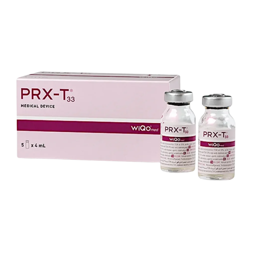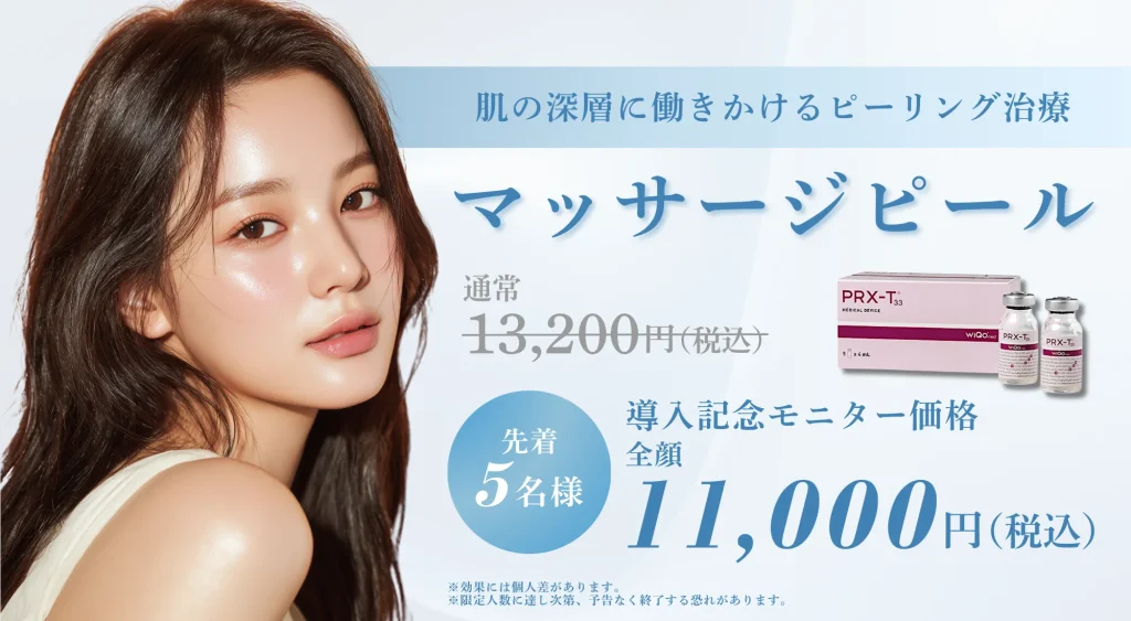 マッサージピール(PRX-T33)は、TCA(トリクロロ酢酸)、過酸化水素、コウジ酸を組み合わせた薬剤を使用し、肌の質感を整えることを目的としたピーリング施術です。薬剤をマッサージしながら浸透させるのが特徴で、角層を過度に剥離させずにケアを行う方法として知られています。