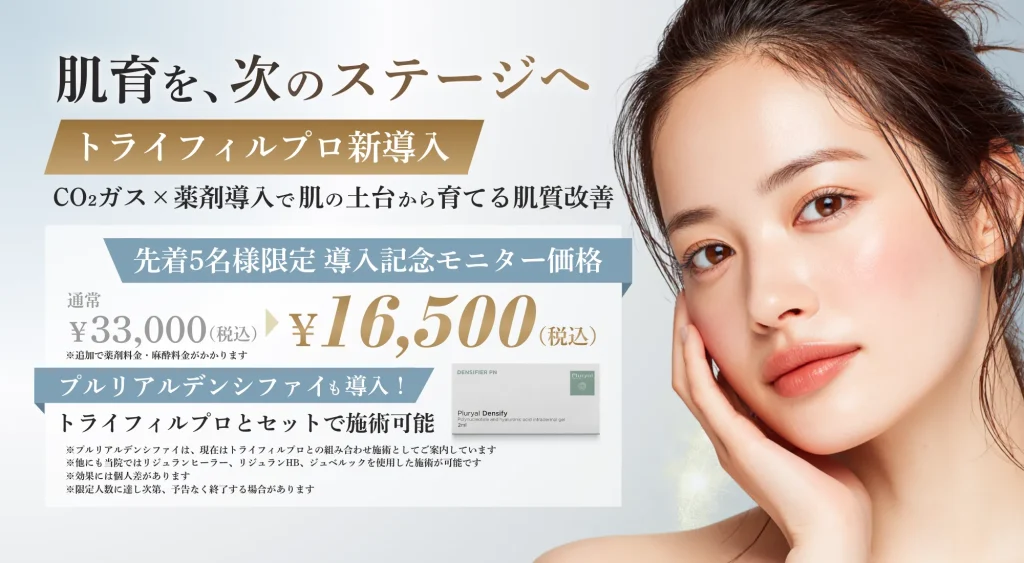 トライフィルプロは、レーザー治療や注入治療と優劣を比較するものではなく、皮膚内部の構造や状態に配慮した一つの選択肢として位置づけられます。
